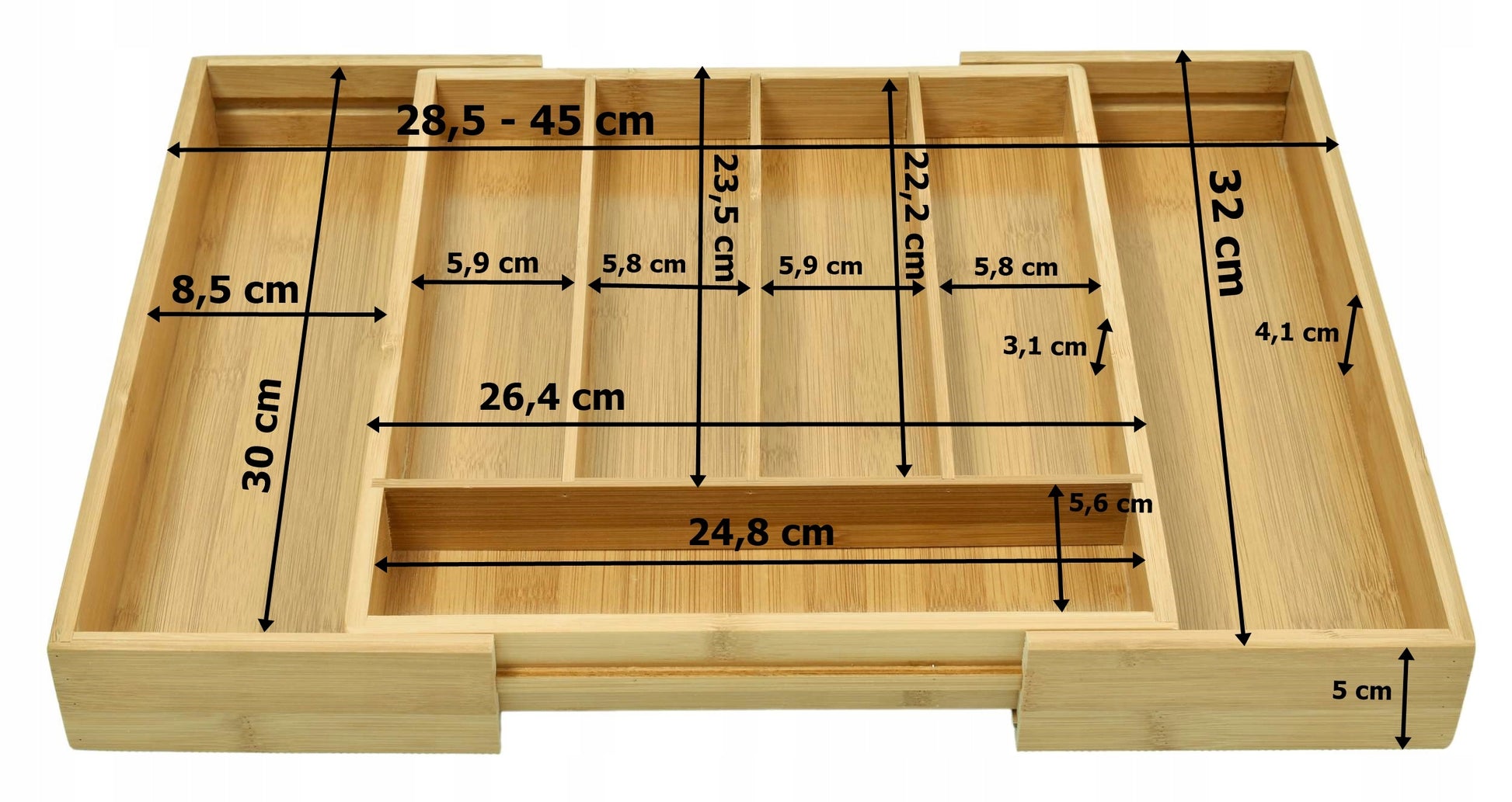 Rozsuwany – 5, 6 lub 7 przegródek, dopasuj do swoich potrzeb i rozmiaru szuflady.